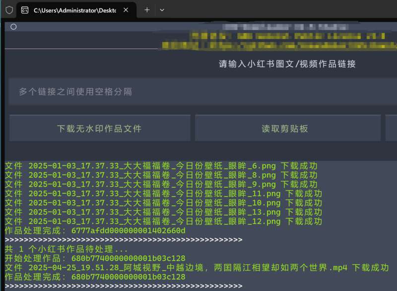 打开小红书视频,点击分享,打开下载程序,点击”读取剪贴板”,点击“下载无水印作品文件”,等待下载完成。